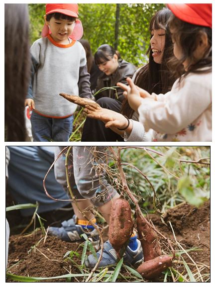 「ここにあるよ!」と学生が伝えると、近寄って一生懸命掘り進める姿もあり、取れた芋を保育者や周りの大人に嬉しそうに見せるなど、芋を取れた喜びを行動で伝える様子が見られました。喜びを共感できる相手とともに自然に触れる活動の大切さを、子どもたちの表情から感じることができました。
