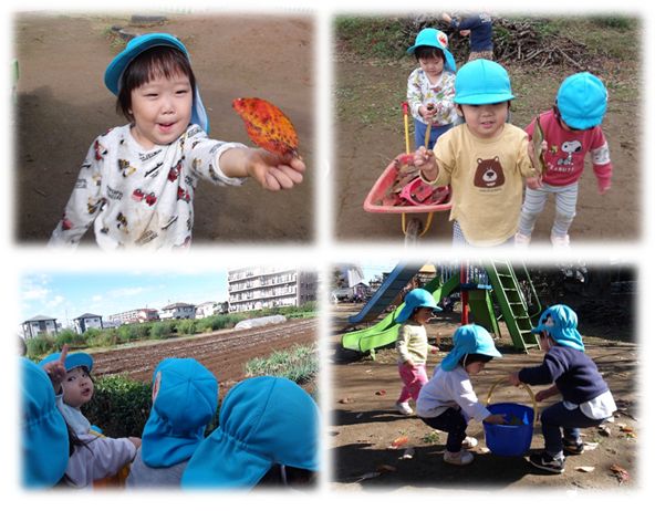 今の時期は、園庭で過ごすだけではなく、学園内の散歩にも出かけ、柿やみかんが実っているのを見たり、きれいに色づいた葉やどんぐりを拾ったり、子ども達にとっての宝物をたくさん集め、楽しんでいます。