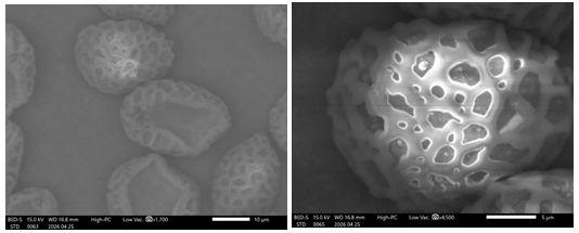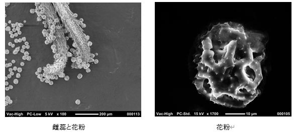 光学顕微鏡は可視光の波長より小さい物を観察できません。しかし、電子顕微鏡は可視光線より短い波長の電子線を利用しているので、とても小さい物も観察できます。更に立体的な像を観察できるのが特徴です。いくつか、本校の電子顕微鏡で撮影した花粉の画像を紹介します。