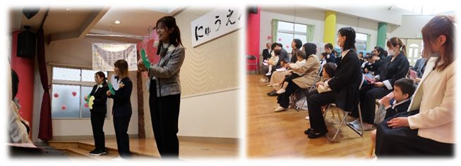 そんなちょっぴり固かった雰囲気も、ペープサートを使った職員の歌や子どもたちの声で徐々に和やかに。最後は笑顔も見られた入園式となりました。
