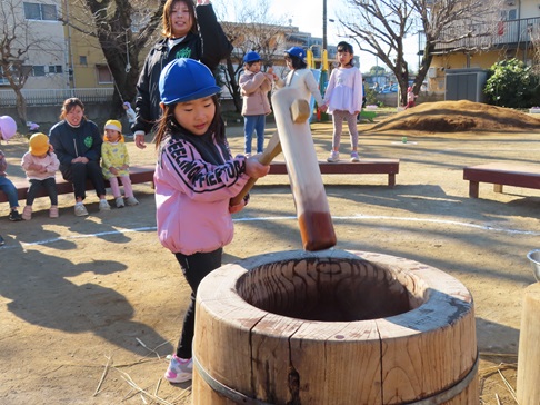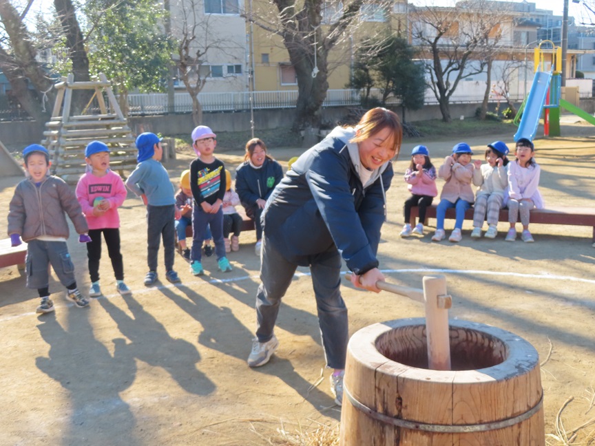 2024年12月19日 (木) 昨日はお餅つきの日!朝から釜でもち米を焚いてホカホカ~準備万端です。 早速お餅つきです!ぺったんこ、ぺったんこ♪みんなの声援で美味しいお餅が出来上がりました。 最後は大人も頑張ってお餅つき!がんばれ~がんばれ~ 小さいお友だちも興味津々でホカホカのお餅を楽しみに待っています...かわいいですね。 そらぐみさんが鏡餅を作ってくれました。 そらぐみさんが丹精込めて作った鏡餅...こども園の繁栄と幸せを込めて☆ by.k