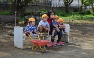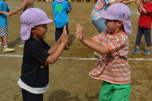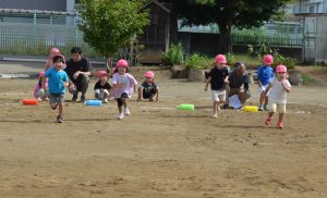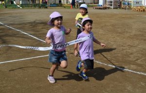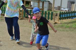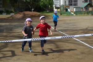「運動会ってなんだ?」と、思っているお子さんも多かったかと思いますが、曲がかかると体操をしたり、かけっこでは楽しそうに走ったり・・・初めての雰囲気にキョロキョロしているお子さんもいましたが、3歳児さんらしい姿だったように思います。