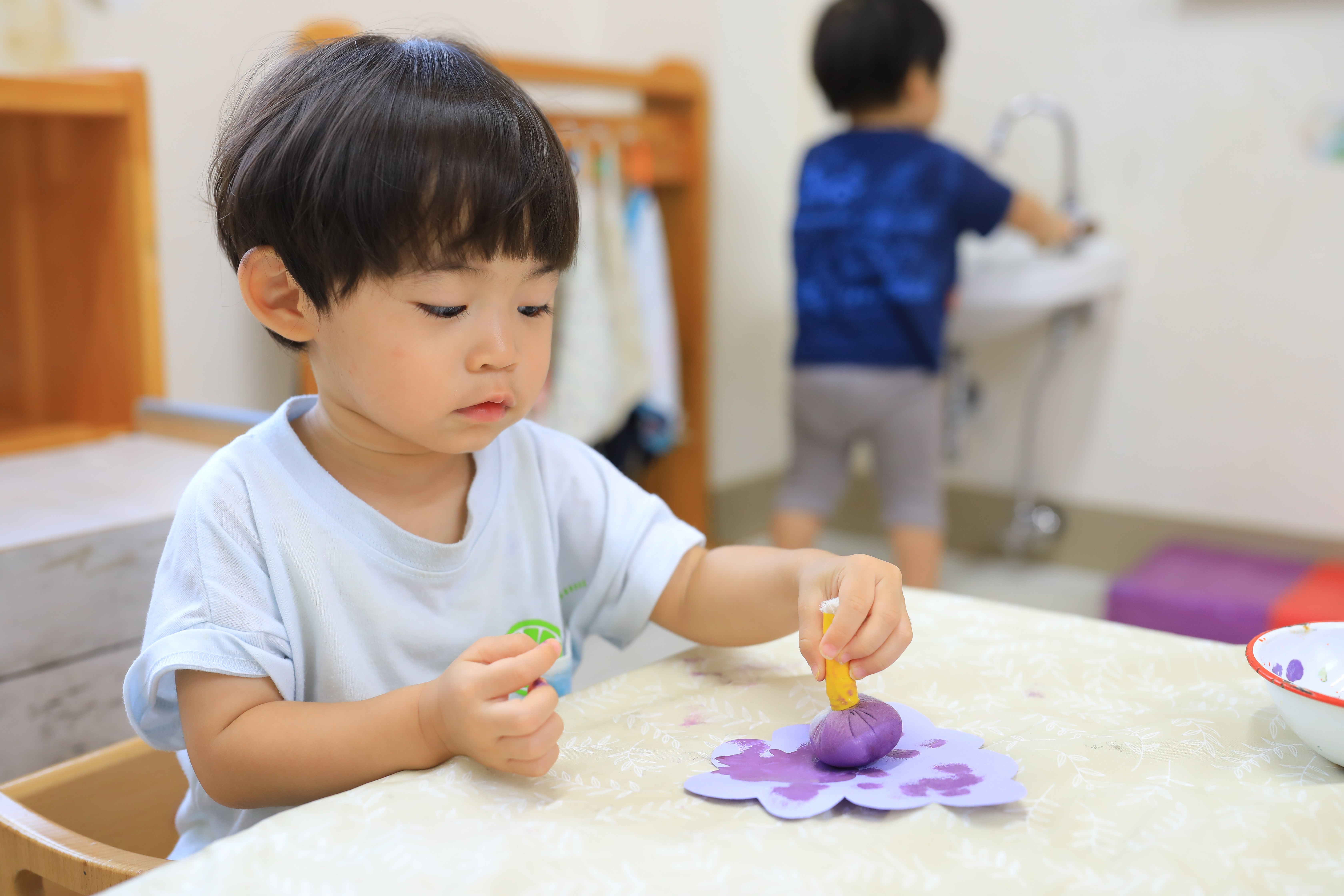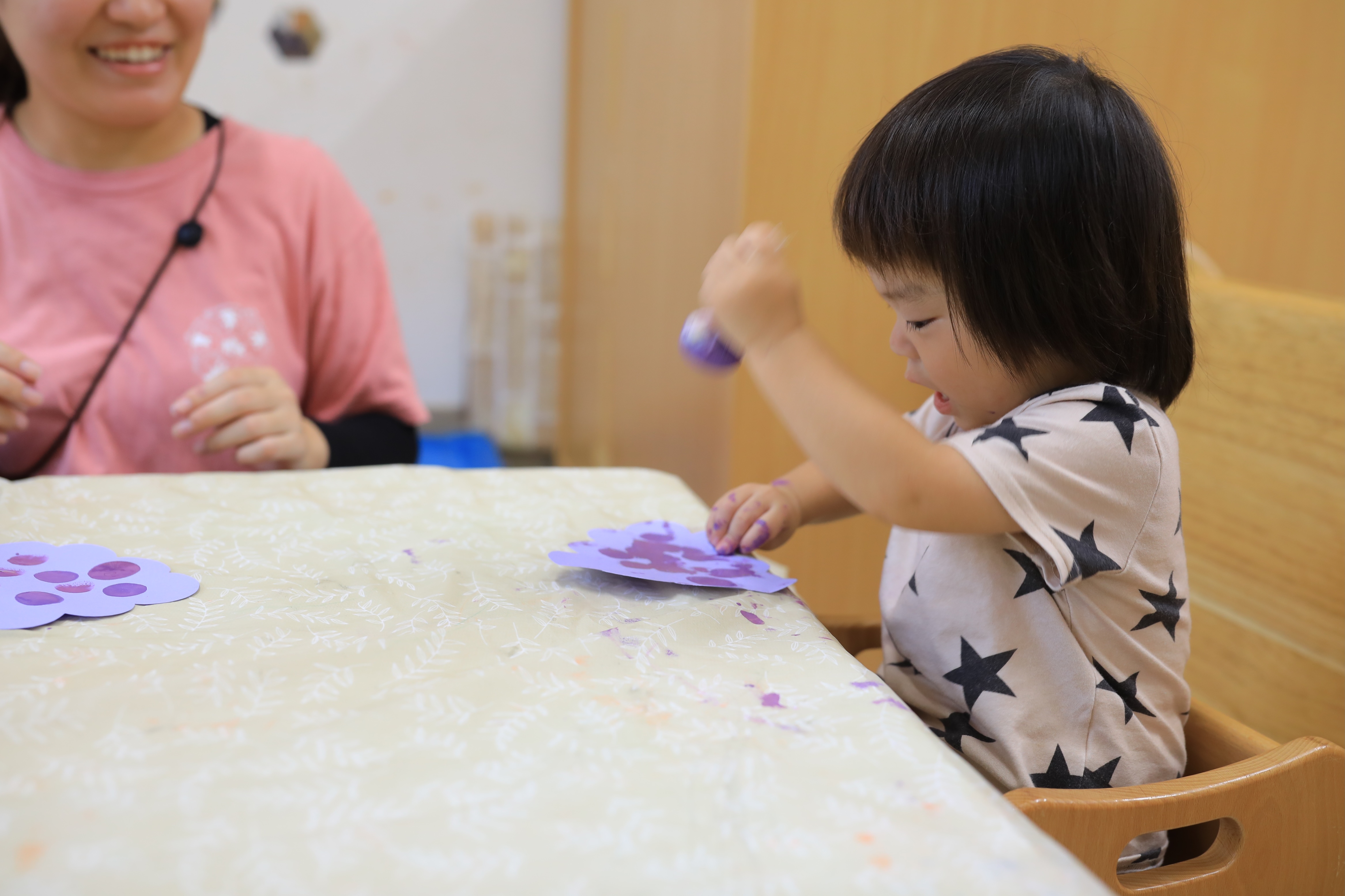 2024年09月27日 (金) すみれ組の子どもたちが絵の具を使って制作を楽しんでいました。画用紙にタンポでトントンしたり、ぬりぬりしたりと画用紙に色がついていくことを何度も楽しむ子どもたち。トントンするうちに自分の手にも色がついていることに気づき、不思議そうに眺める可愛らしい姿も見られました。明日はどんな姿を見せてくれるか楽しみです