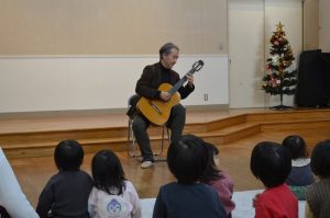 0歳~2歳児クラスと3歳~5歳児クラスに分かれ、2部構成で公演していただきましたが、どちらの回も子どもたちが聴き入ってしまう程の美しい歌声と素敵なギター演奏♬