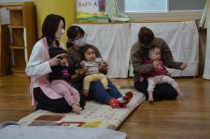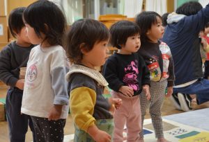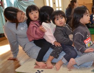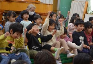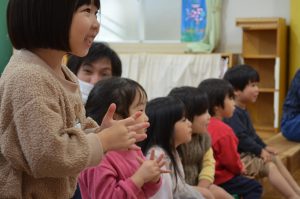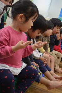 手を動かして真似をしたり、「エビカニクス」や「バスにのって」の曲で身体を動かしたりすることで、また違った雰囲気となり、子どもたちも飽きることなく楽しめていたようです。