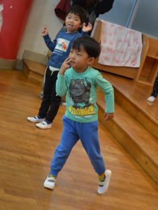 聴きなれない曲に、0歳児~2歳児のお子さんは、直立不動・・・なんてこともありましたが、3歳以上児さんはさすがですね、ノリノリで前に出て一緒に踊っていました☆