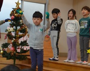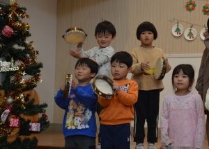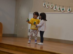 そら組はハンドベルで「きらきら星」と、ペープサートや踊りで「うさぎ野原のクリスマス」を披露しました。