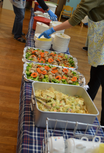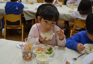 ピラフにコーンポタージュ、チキンにポテトチップスサラダ、フルーツポンチと盛りだくさん!