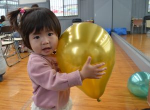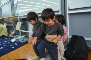 1歳児さんは、お部屋にあった大きな鏡も魅力的だったようで、曲をバックに鏡に映る自分を見て喜ぶ姿もありました♪