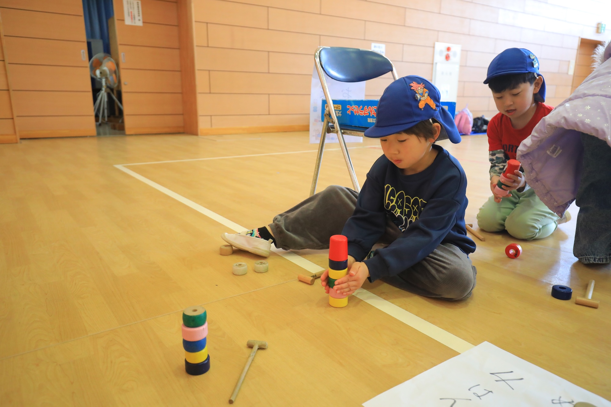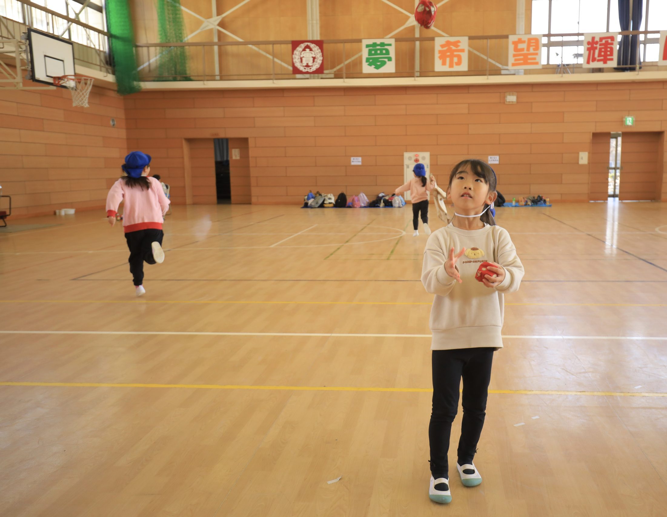 お手玉やプラトンボ(羽がプラスチックでできた竹とんぼ)、けん玉、だるま落とし等、やってみたいものを自分で選択して、夢中になって遊ぶ子どもたちでした。