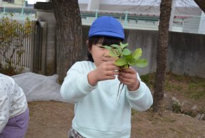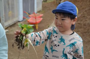 また、園庭で育てていたミニ大根が大きくなったので、昨日5歳児に手伝ってもらい収穫をしました。