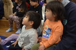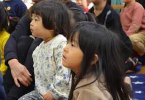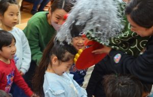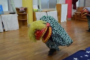 集い後、玄関に獅子頭を置くと、興味のある子が来て、口をパカッ。
