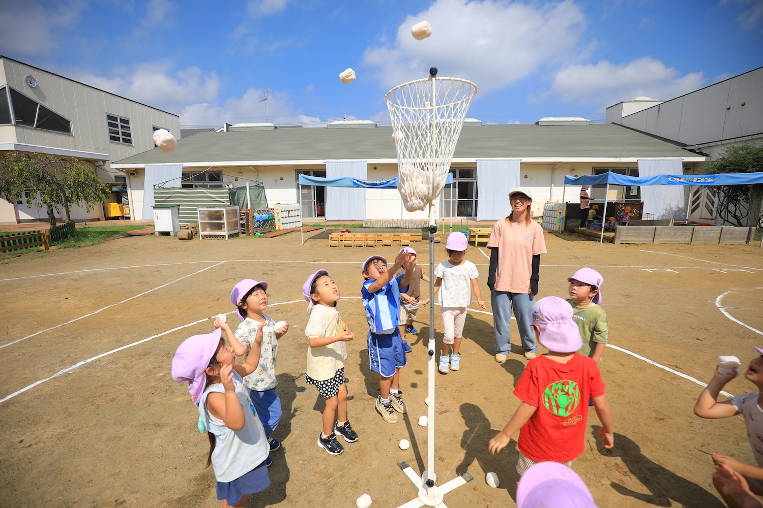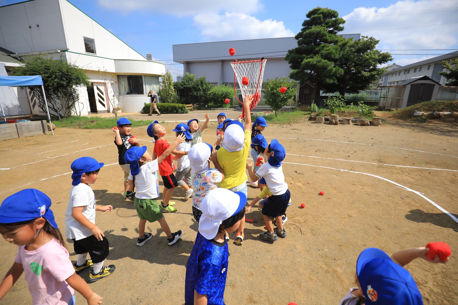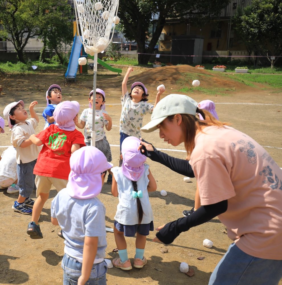 2025年09月17日 (水) 今日は戸外で4・5歳児が玉入れで対決!! スタートの合図で玉を手にすると一生懸命にカゴをめがけて投げ入れる子どもたち。 1回で入らなくてもすぐさま拾い、終わりの合図がなるまでは何度も何度も投げることで、どちらもカゴの中にたくさん玉が入りました。 担任がカゴから玉を出して数える時には、一緒に声を出して数えながらもその表情はドキドキしている様でした。 最後には、大人対子どもたちの対決もあり、大盛り上がりの玉入れでした。