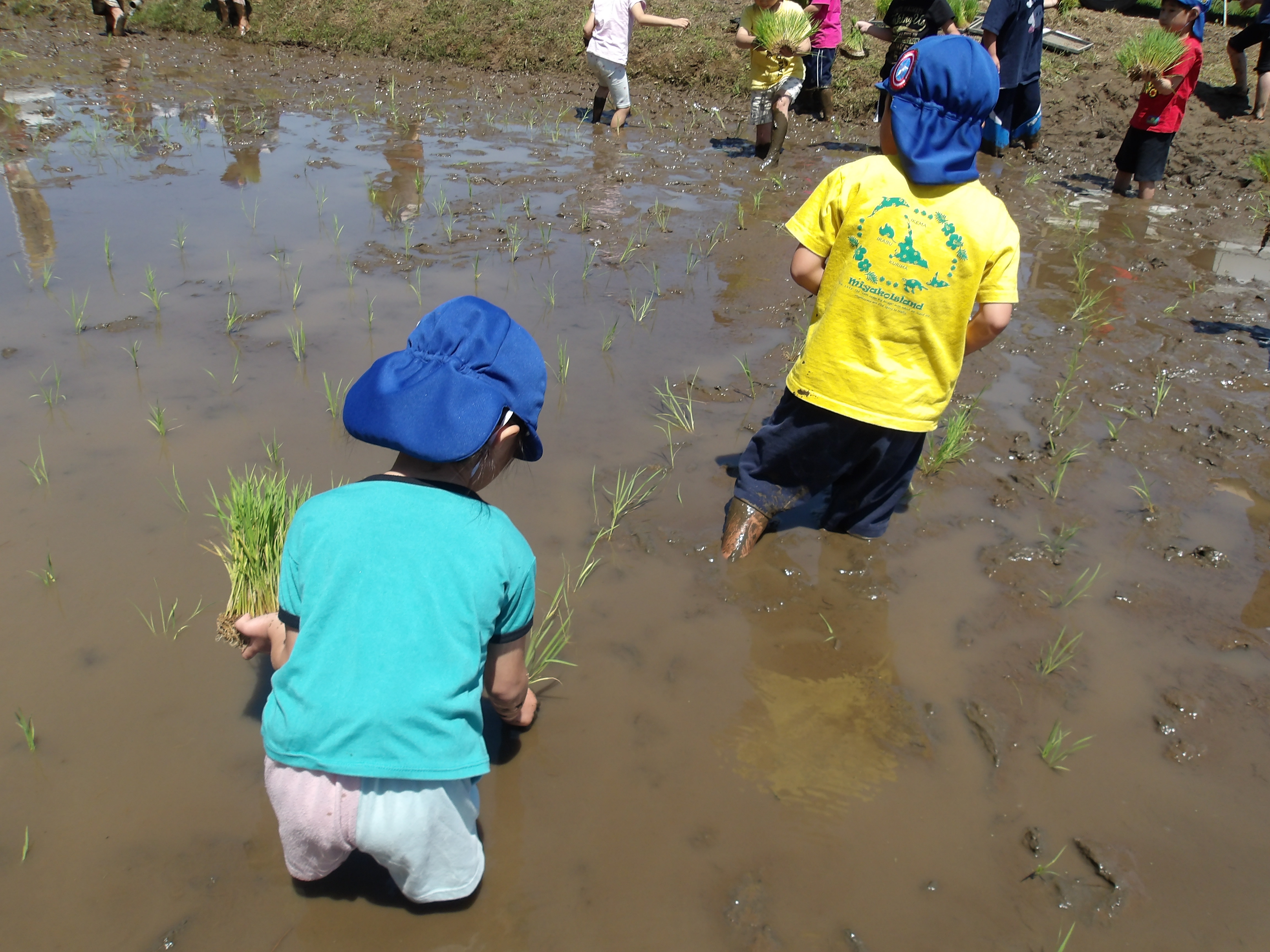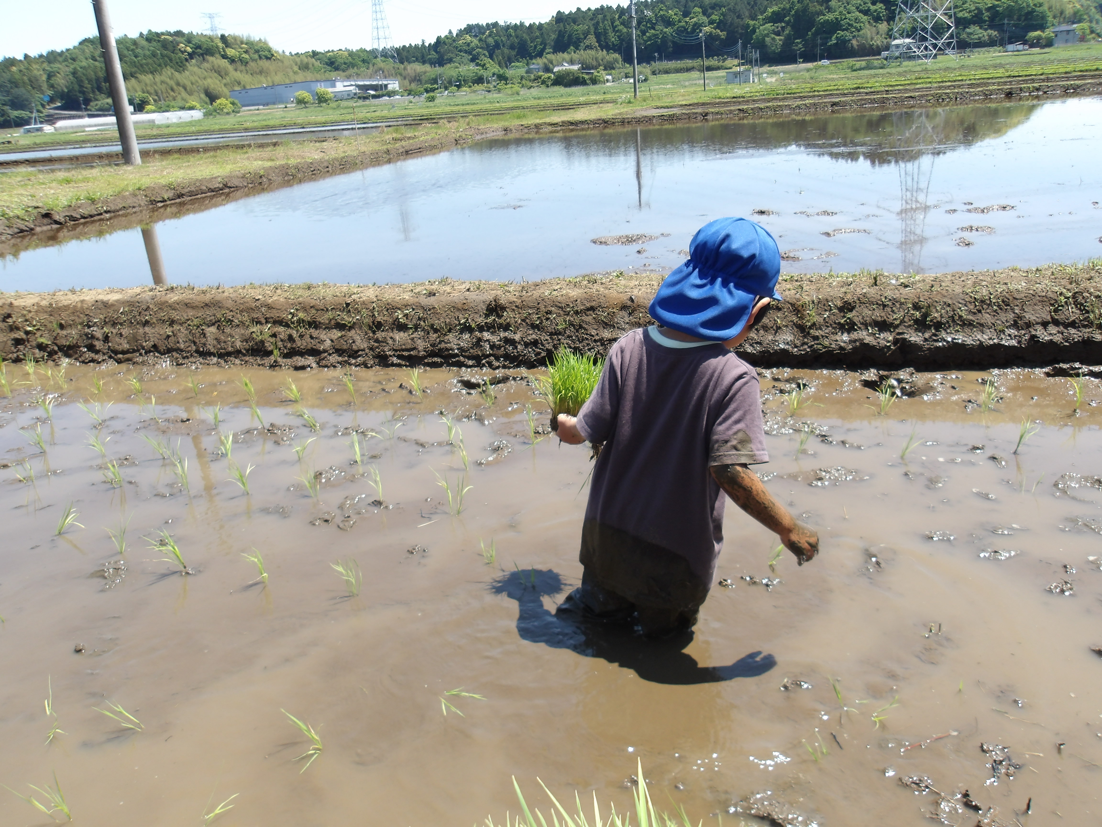 先日バスに乗って田植えに行きました。最初は苗を植えることが簡単と思っていた子も、田んぼの中に入ってみると歩くことさえ難しい姿が見られました。しかし近くで行っている大人の姿を見て、真似をしてみる姿も見られました。