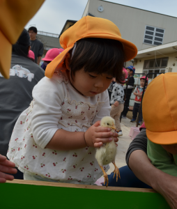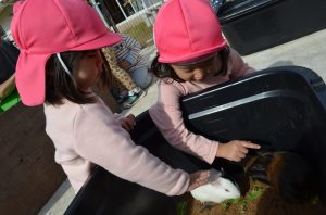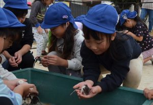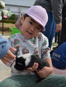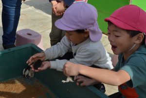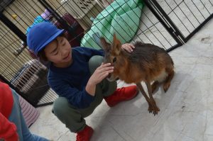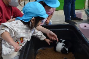 ふれあいが始まると、少し控えめに見ている子もいれば、積極的にかかわる子もいて、中には「終わりだよ~」と言っても、動物たちのかわいらしさに離れられずにいる子もみられました。