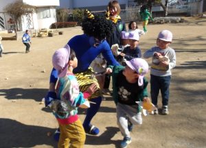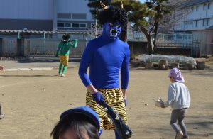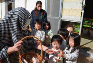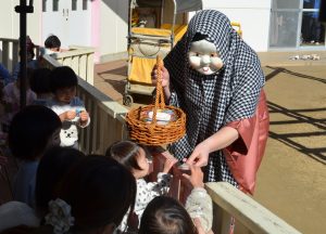 福の神の顔に後ずさりする子もいましたが、贈り物はしっかり受けて取っていましたよ(笑)