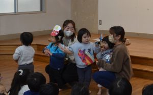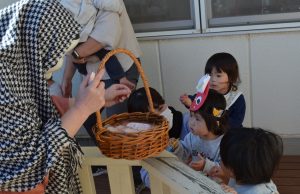 今日の節分会では、由来を聞いたり、歌をうたったり、自分たちで作った豆(新聞を丸めたもの)を入れる入れ物を紹介したりして過ごし、楽しい雰囲気♬