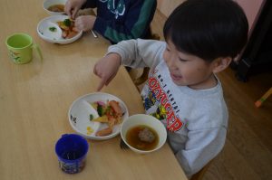 とんがりコーンやウインナー、グリンピースで鬼の顔を自分たちで作りました。