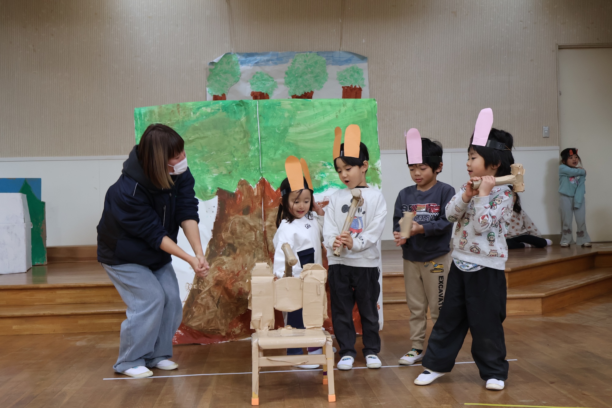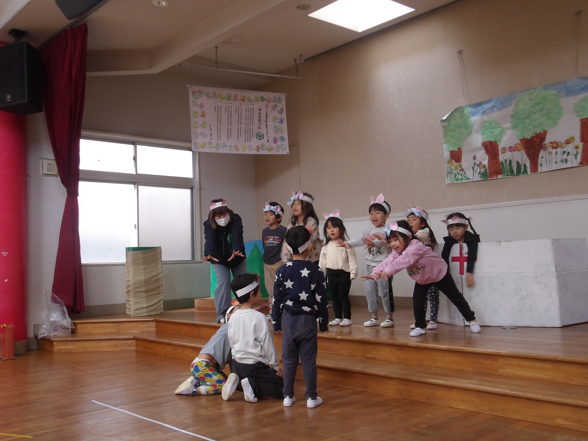 2026年02月20日 (金) 育ちを祝う会は終わりましたが、子どもたちの劇遊びでの表現はまだまだ続いていて、3歳児さくら組と4歳児ふじ組が互いのクラスの劇遊びを一緒に行って楽しむ姿がありました! 見せ合いっこをした時から他クラスの劇遊びにも興味をもち始めた子どもたちは、大人が思っている以上に他クラスのお話も頭に入っており、クラス関係なくやりたい役をのびのびと表現して楽しみ、笑顔が溢れる時間となりました。 次は5歳児そら組とも一緒に劇遊びしたいという子どもたちの声があり、来週は子どもたちのどんな表現が見られるか楽しみです♪
