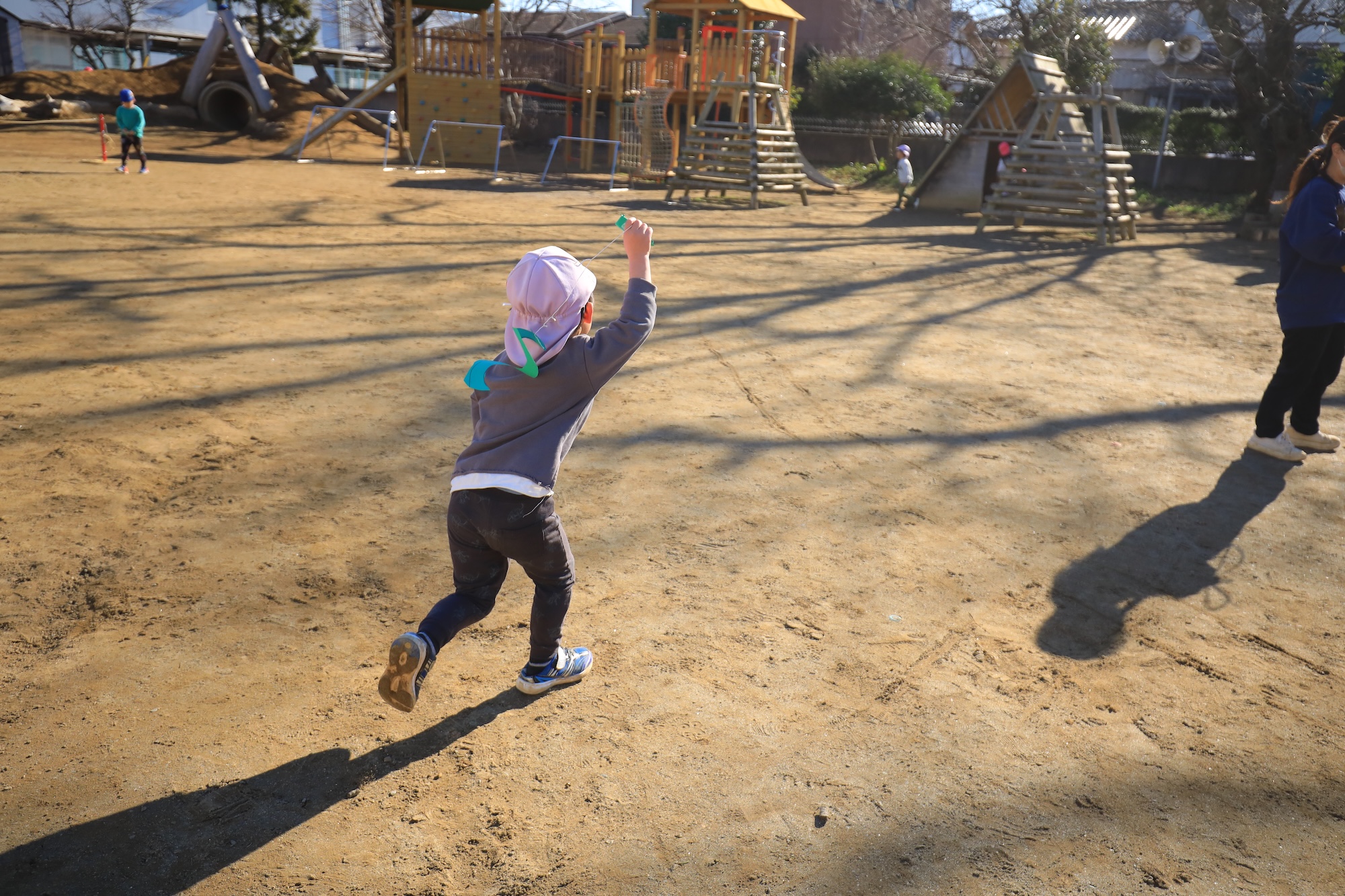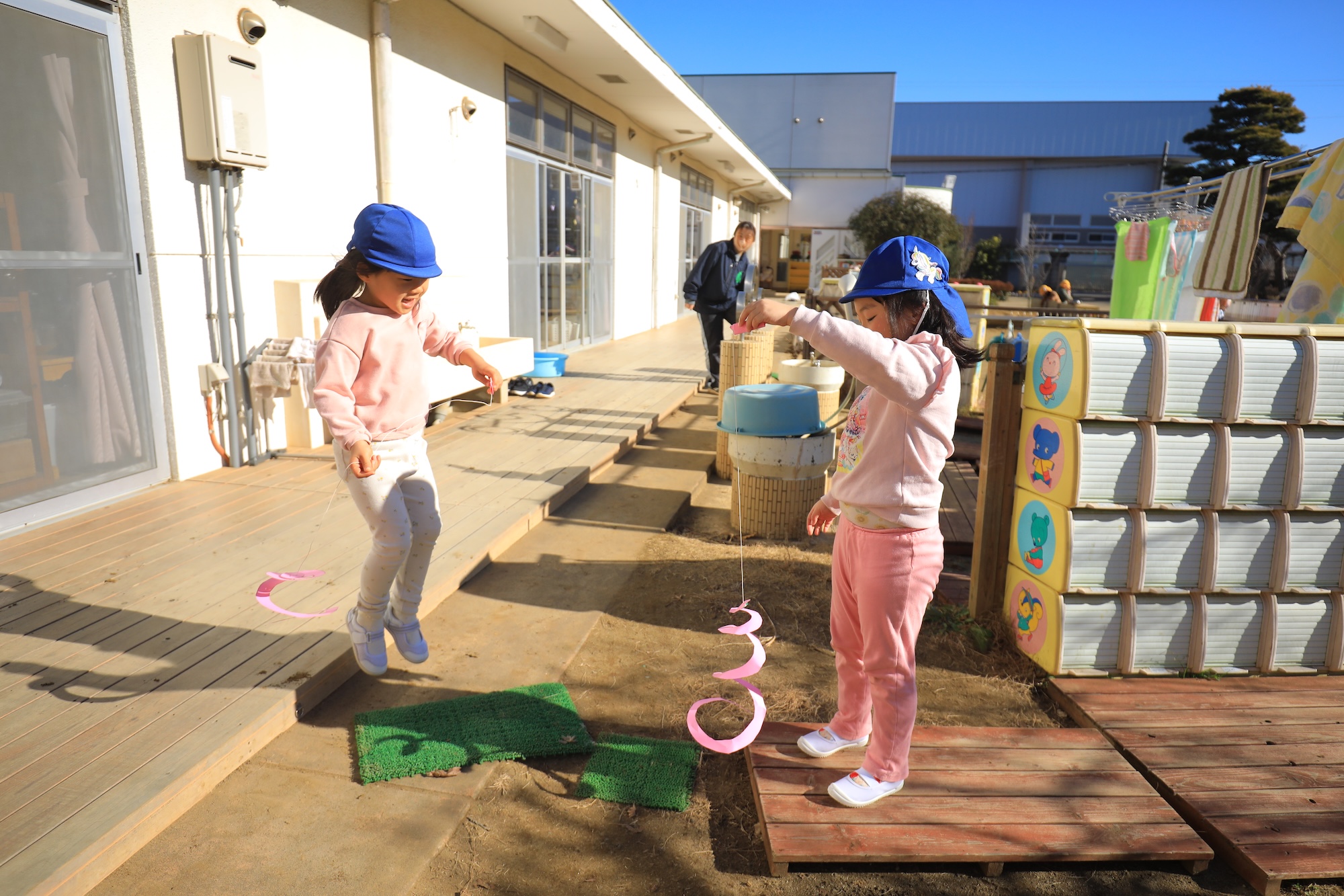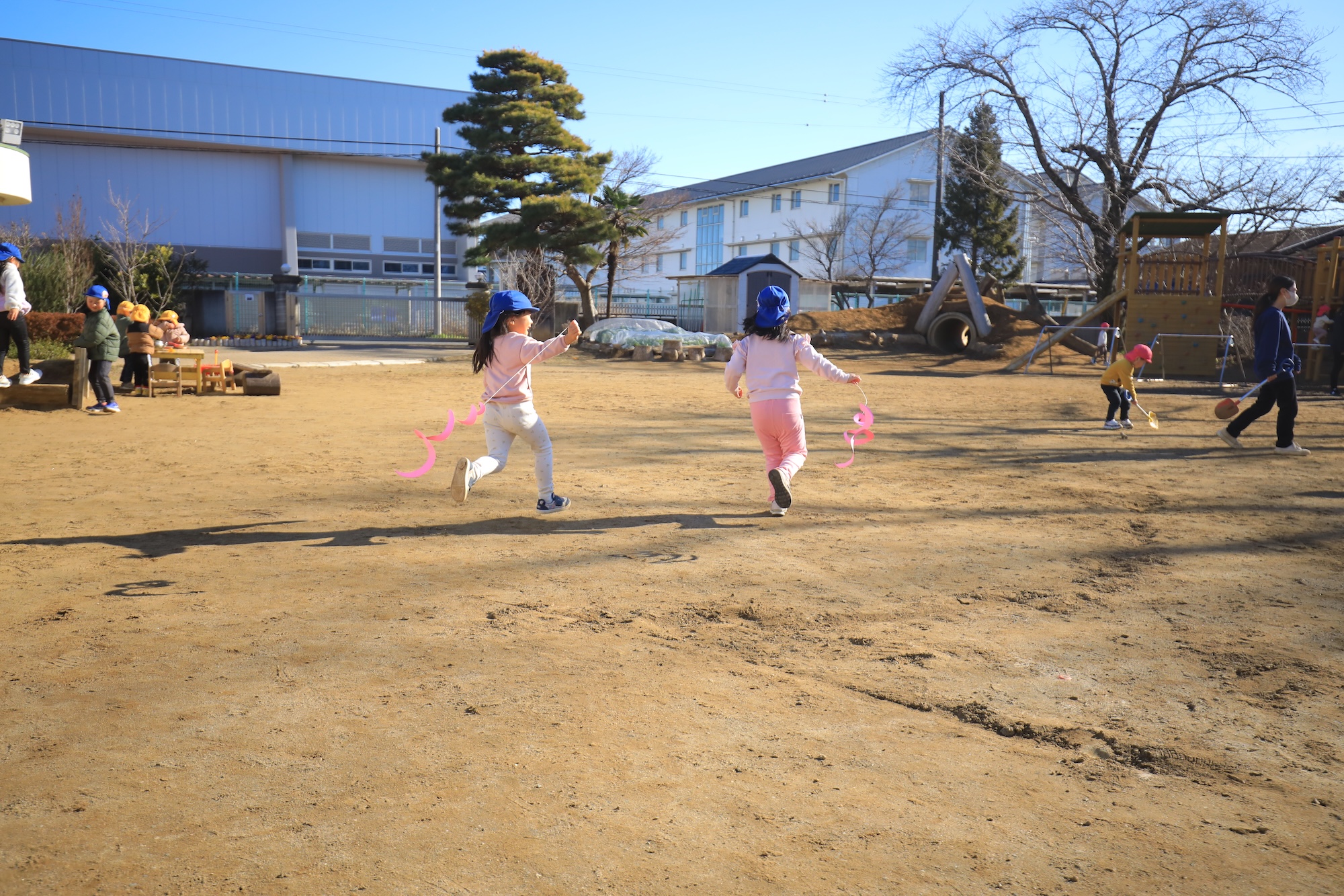 2026年01月6日 (火) NEW あけましておめでとうございます。 本年もよろしくお願いいたします。 年が変わり、昨日から子どもたちの元気な姿が戻ってきました。 今日は、5歳児の子どもたちが画用紙を渦巻状に切って遊び道具を作る姿が見られました。 切った画用紙は、走ると風の力を受けとクルクルと回り始め、子どもたちもその動きを楽しんでいました。 5歳児が遊んでいる様子から4歳児の子も刺激を受け、自分の物を作ったら園庭を駆け抜け、楽しむ中で憧れの5歳児と同じことができることを喜んでいる様でした。