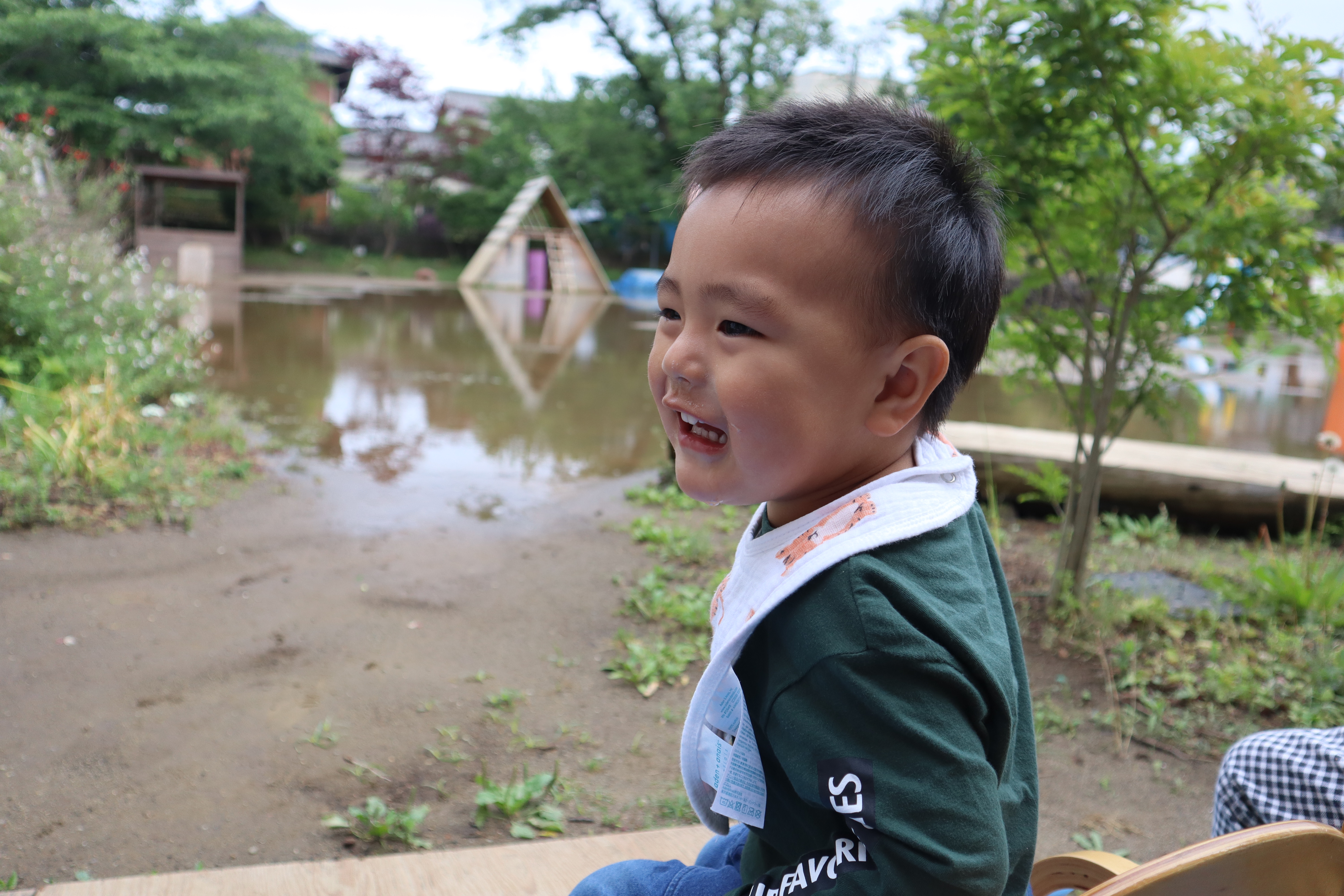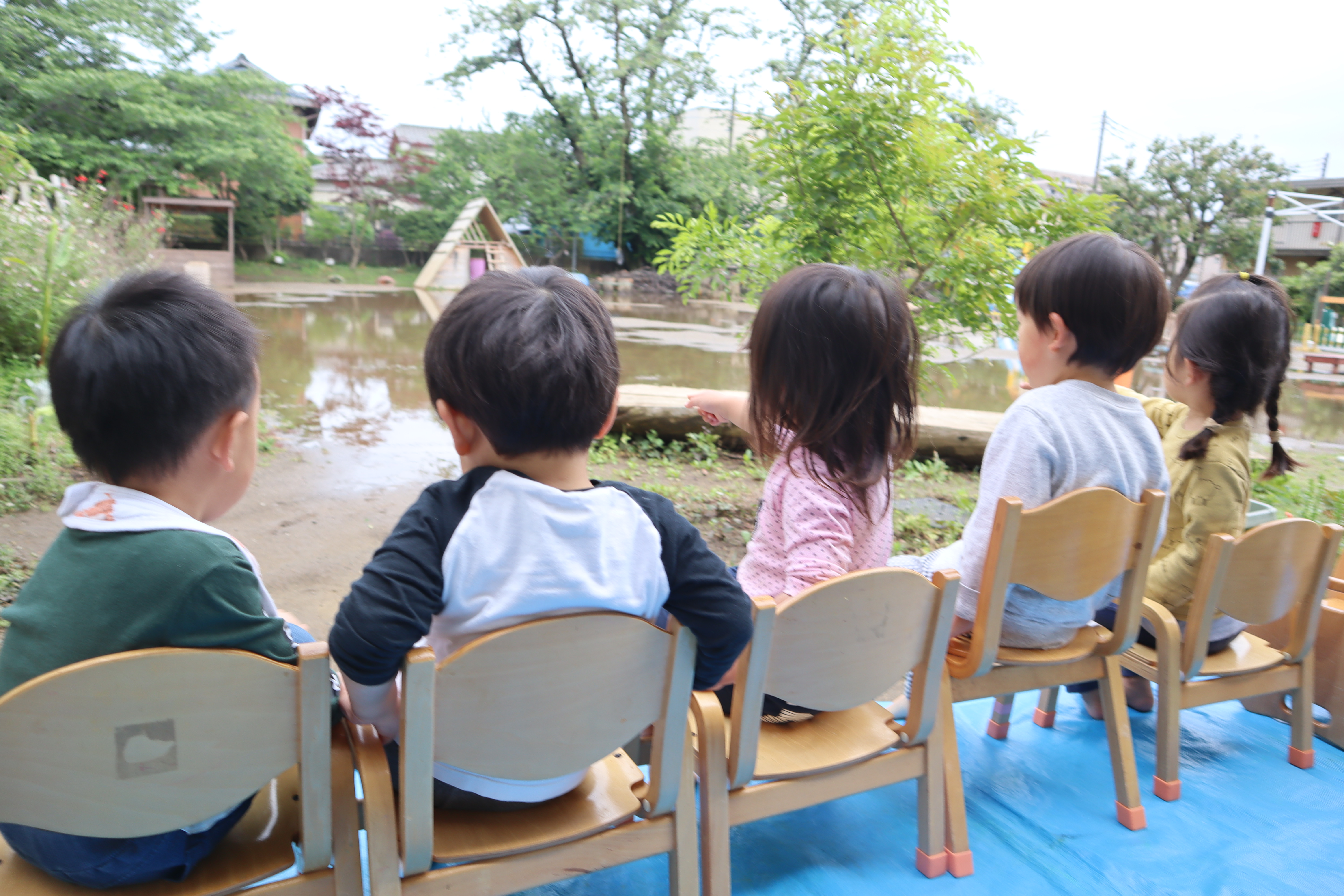 雨が上がって、子どもたち自ら、自分の椅子を持ってきて横に並べて「すごいね」「雨がいっぱい降ったから?」「泳げるかな」と嬉しそうに話す姿がありました。
