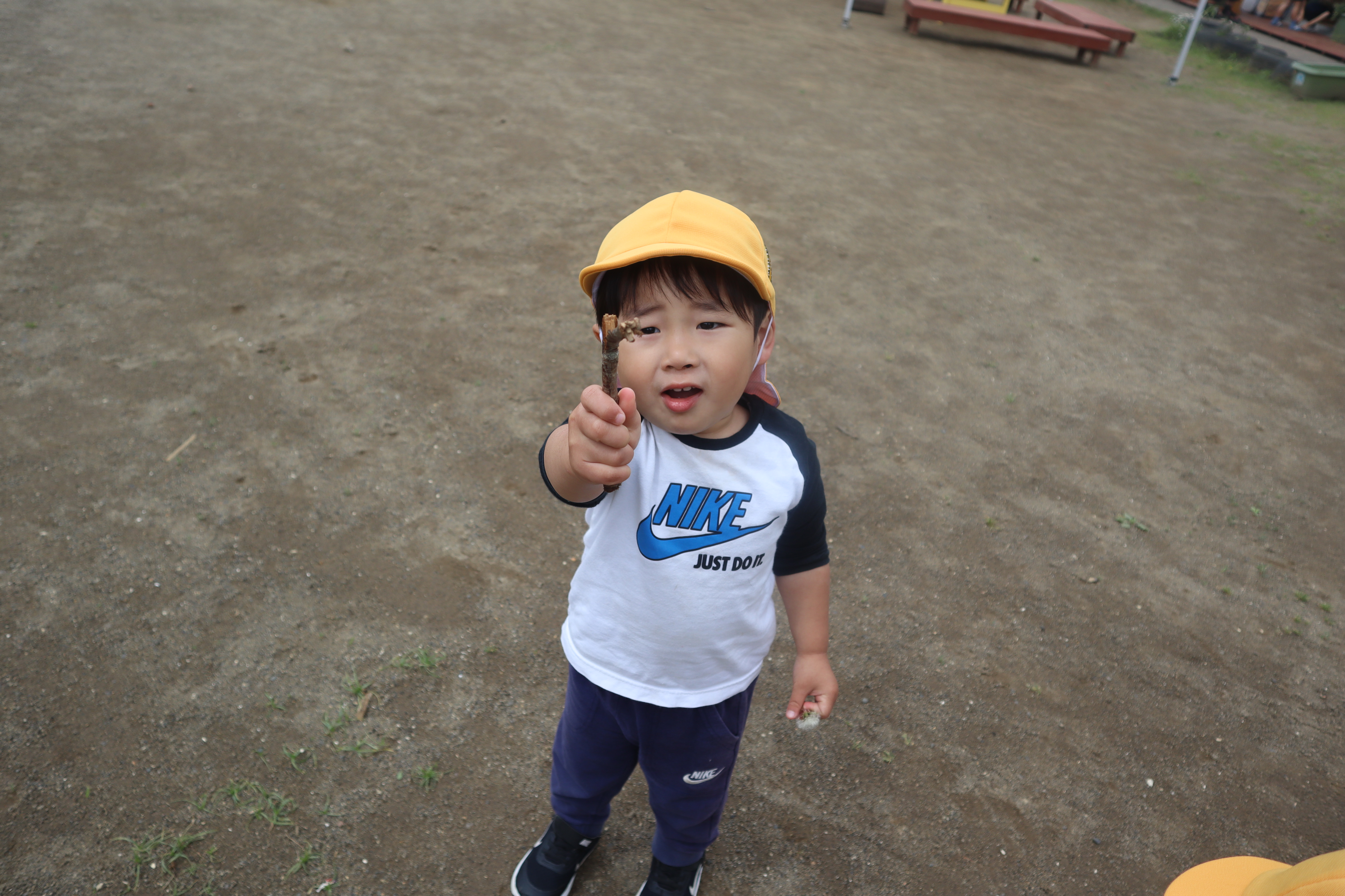 園庭に落ちた木の枝を集めて、「これはママの、これはパパの、これは~」と家族全員分の木の枝(銃)を集めていました(*^^*)