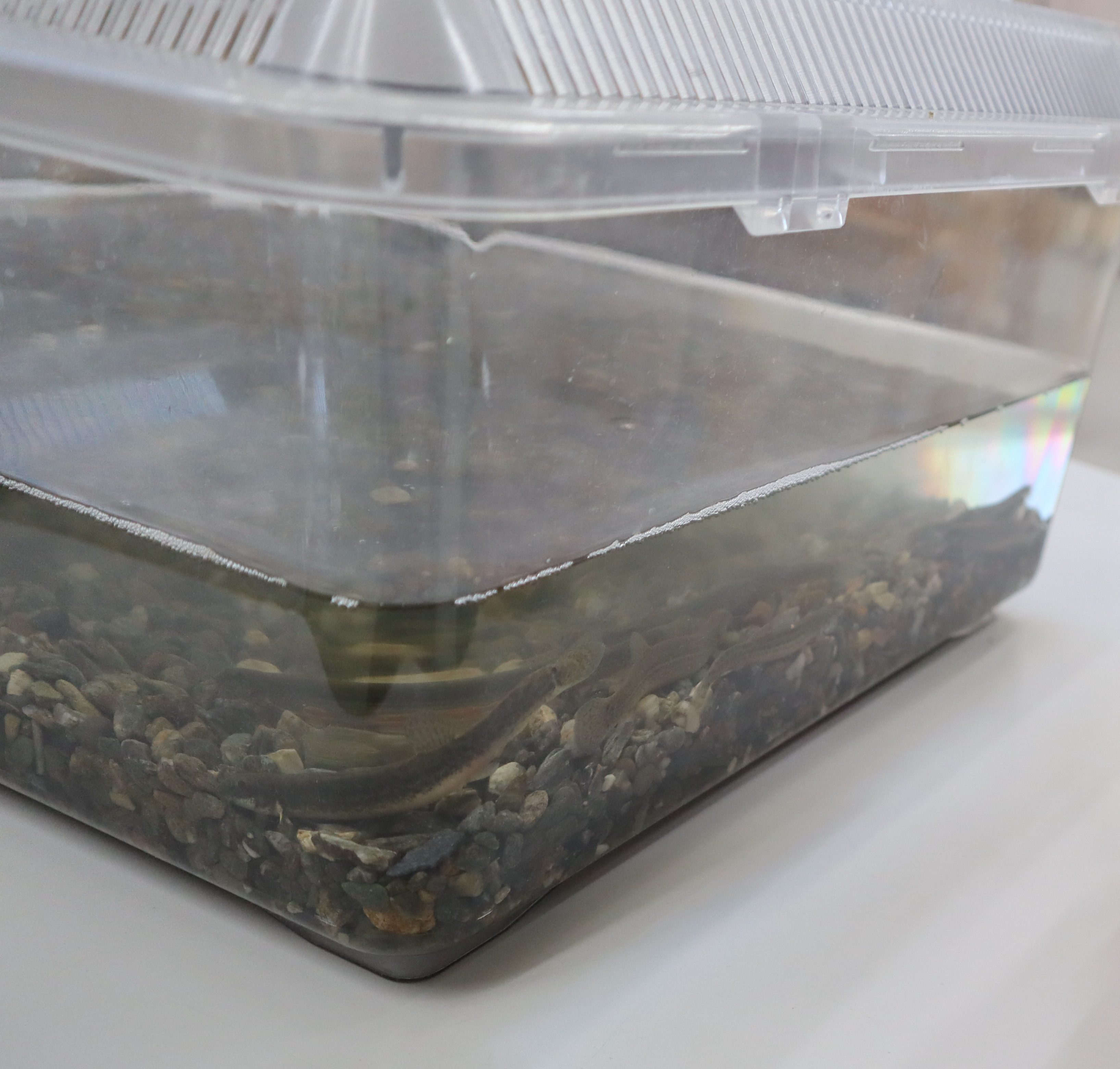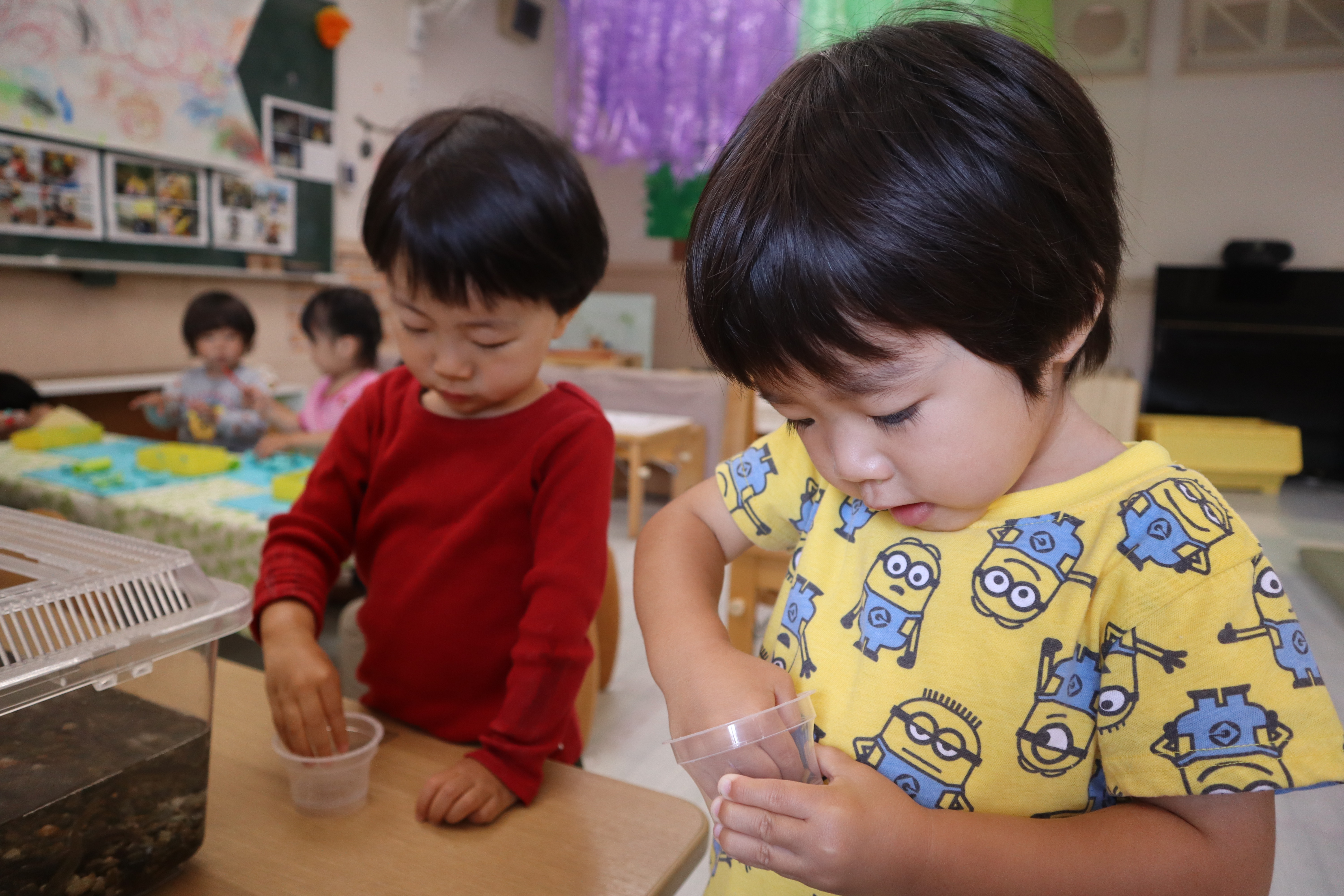 子どもたちが、「どじょうさんにご飯あげなきゃ」と嬉しそうに餌やりや、保育者とお掃除を楽しんでいます。