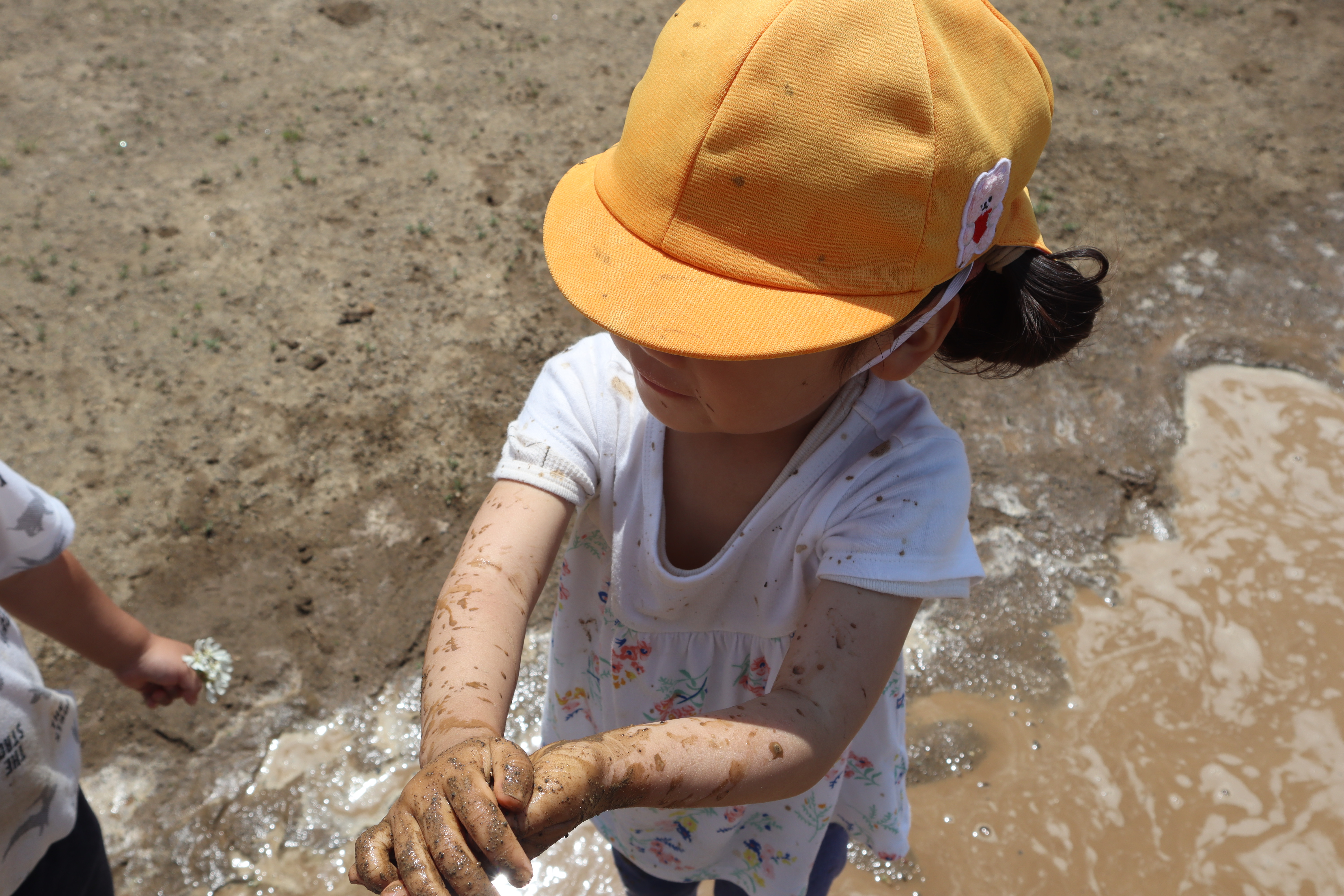 子どもたちは泥遊びになると、泥の中を足をバタバタと踏み鳴らし、ぬかるんだ土の感触を楽しんだり、全身を使ってダイナミックに楽しんだりしています。