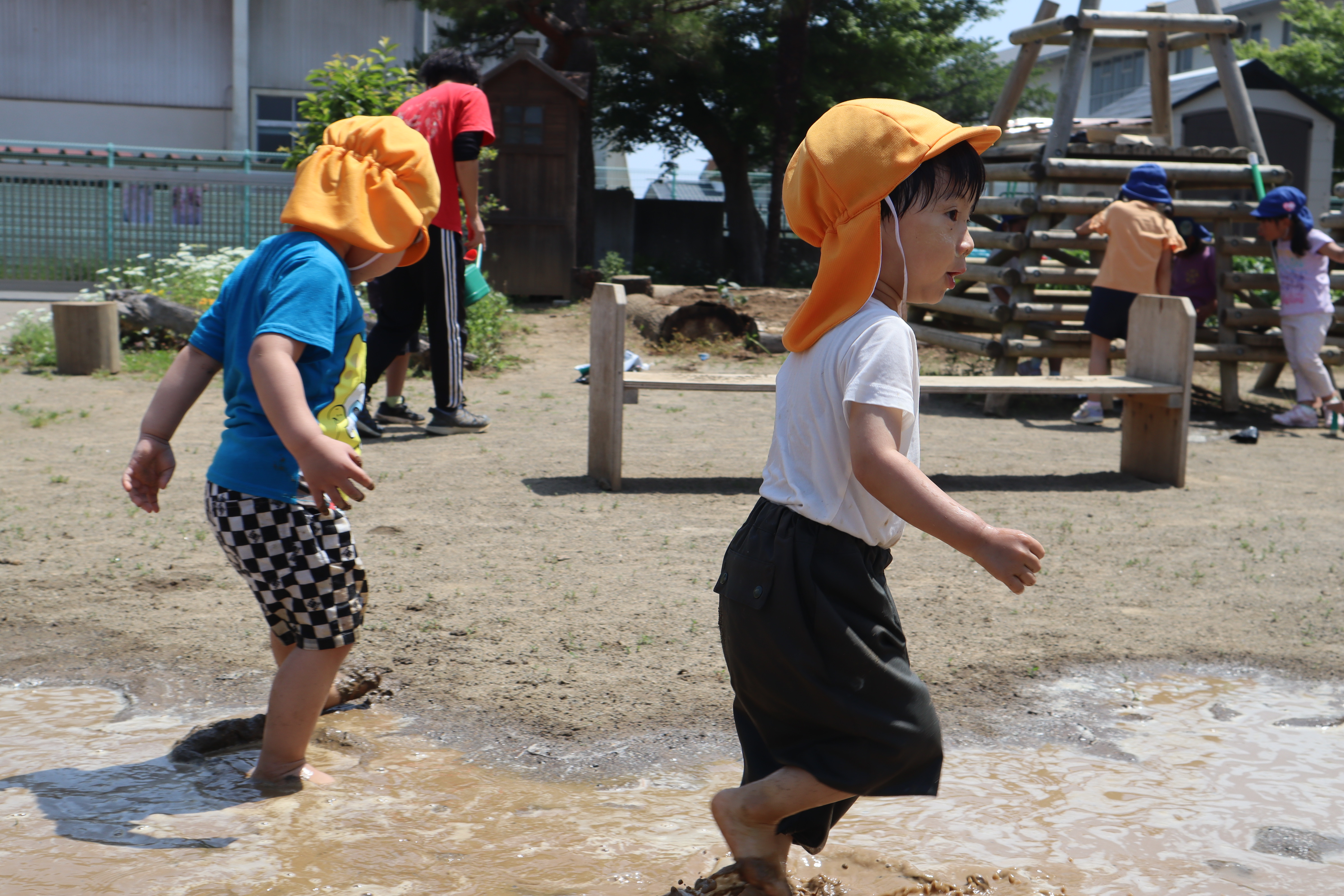 先日、大雨が続き、なかなか乾かずに雨水が園庭にあふれて、大きな池のような水溜まりが出来ました。