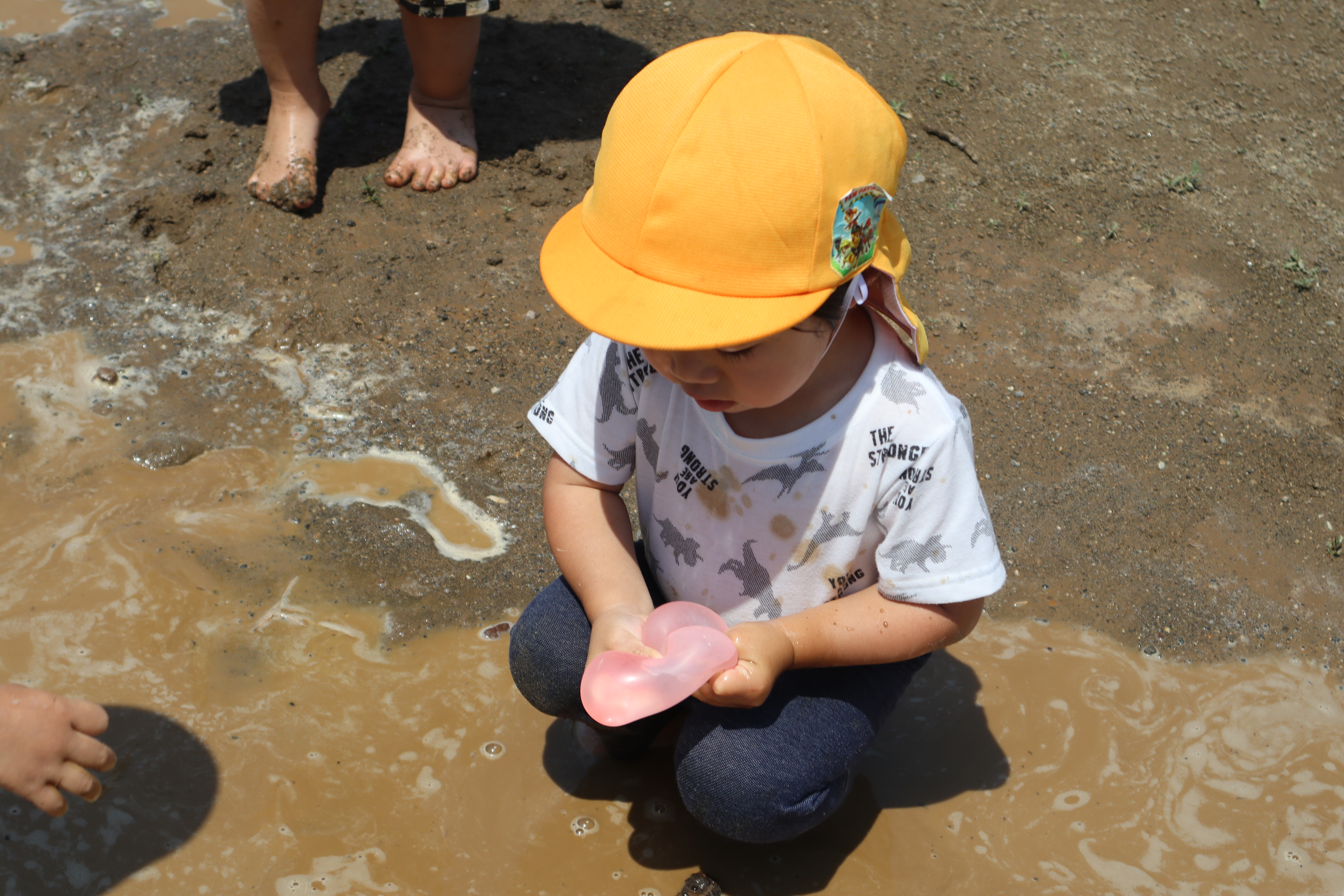こちらは、水風船を用意すると、そーっと、そーっと大切に割れないように持ち、泥も楽しみたい様子。