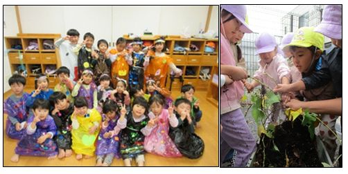 おばけブームが続く中、ハロウィンの時期を迎え、おばけや魔女になりきりたい子どもたちと衣装作りをし、何日もかけて作った衣装を着た子どもたちの笑顔は、とても輝いていました。それに加えて、私たちはハロウィン本来の意味である収穫祭をどのように子どもたちに伝えるかを考え、春に子どもたちと一緒にプランターに植えたさつま芋がちょうど食べごろとなり、子どもたちと収穫をしました。今は園内のカウンターに飾られています。