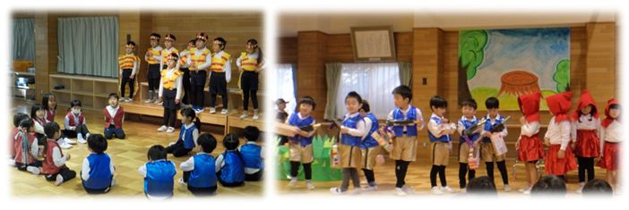 年中児は各クラス好きな絵本から題材を選び劇にして発表しました。登場人物になりきる面白さや友達と一緒に表現する喜び、リズムに合わせて動く楽しさなど、保育者や友達と一緒に楽しみながら進めていきました。その中で、登場人物のやり取りの面白さを感じたり友達の前で役になって表現することが恥ずかしくて思うようにできなかったり、いろいろな思いをもちながら取り組みました。当日は、保護者の前で発表できたことが一人ひとりの自信につながり、喜びや達成感を味わうことができました。