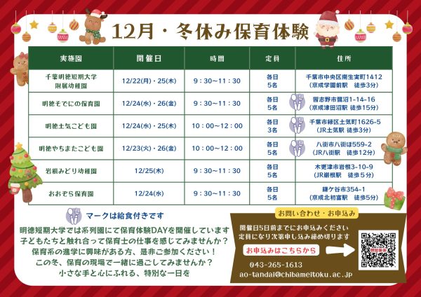 12月22日(月)~26日(金)の冬休みの間で、各地域で高校生保育体験を開催いたします。