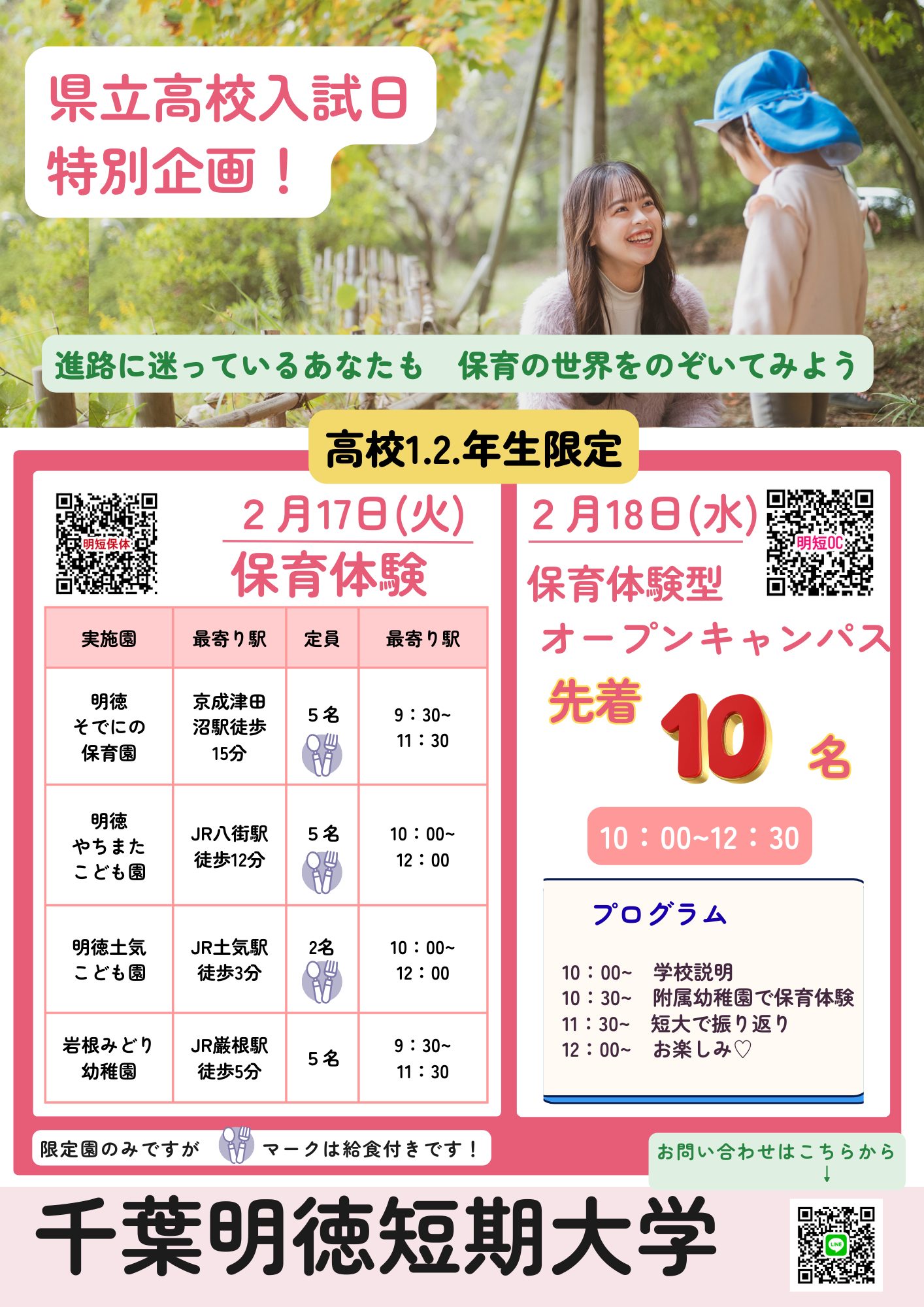 県立高校入試日のため高校1・2年生向けの保育体験を開催します