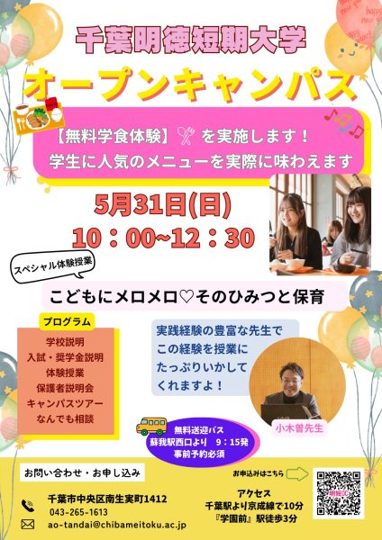 めいとくの先生方による 「体験授業」、子どもがいつもいるキャンパスを体験できる 「キャンパスor附属幼稚園ツアー」 、在学生が明徳短大でのリアルな学生生活を語る 「在学生or卒業生トークライブ」、保育者を目指す人が利用できる 「奨学金説明」、入試突破のコツを教えてくれる 「入試説明」、学生スタッフが運営し、在学生とお話できる 「 なんでも相談コーナー」などなど、何回来ても楽しめるコンテンツをご用意しております。 是非お気軽にお越しください。 学生スタッフ・教職員一同、みなさまのご来場を心よりお待ちしております!