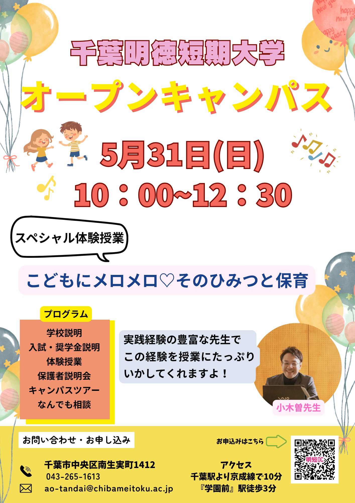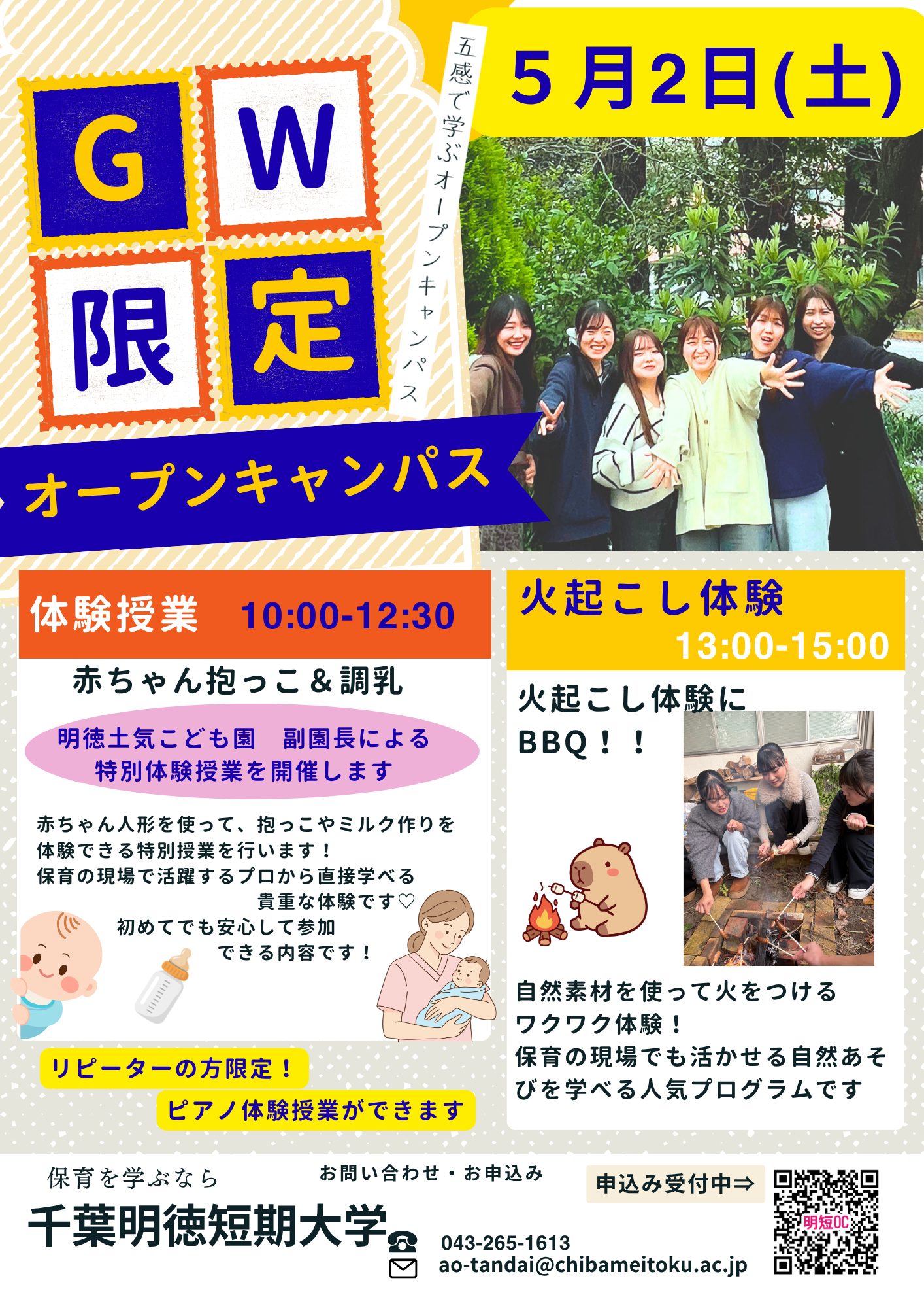 めいとくの先生方による 「体験授業」、子どもがいつもいるキャンパスを体験できる 「キャンパスor附属幼稚園ツアー」 、在学生が明徳短大でのリアルな学生生活を語る 「在学生or卒業生トークライブ」、保育者を目指す人が利用できる 「奨学金説明」、入試突破のコツを教えてくれる 「入試説明」、学生スタッフが運営し、在学生とお話できる 「 なんでも相談コーナー」などなど、何回来ても楽しめるコンテンツをご用意しております。 是非お気軽にお越しください。 学生スタッフ・教職員一同、みなさまのご来場を心よりお待ちしております!