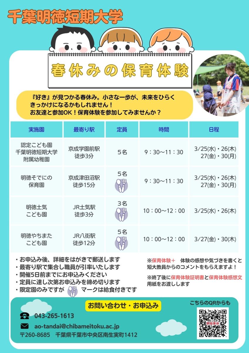 体験から学ぶ千葉明徳短期大学だからこその保育体験です。たくさんの参加をお待ちしています。